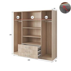 Praktiskās īpašības: Skapja plašais interjers piedāvā optimālu plauktu skaitu un vietu drēbju pakarināšanai, kā arī trīs parocīgas atvilktnes, kas ļauj ērti uzglabāt aksesuārus un citus priekšmetus. Tradicionāli atvērtās durvis nodrošina vieglu piekļuvi visam saturam, kas padara šo modeli par izcilu izvēli guļamistabai, garderobei vai priekšnamiem.