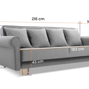 - Dizains: Koka kājas, noapaļoti roku balsti un mīkstas dekoratīvās spilveni