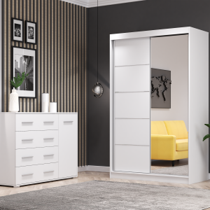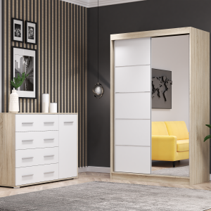 Iekļauts drēbju skapis un kumode NEOMI 05 FRIDA 02 Neomi – moderns skapis ar spoguli modernās krāsu kombinācijās. Tas lieliski iederēsies. daudzos interjeros: guļamistabā, dzīvojamā istabā, bērnistabā vai ģērbtuvē. Bīdāmo durvju sistēma padara to viegli lietojamu un neaizņem vietu. Tas ir sadalīts divās daļās, aprīkots ar vairākiem plašiem plauktiem un stieni. Priekšā novietots spogulis dekorēs un optiski palielinās telpu. Kumode Frida 02 jūs pārsteigs. augstākaisżaugstākaisą funkcionalitāte, skapjos paslēpto atvilktņu un plauktu kombinācija ir ideāla. viesistabā, guļamistabā un jebkurā citā telpā, kur to var izmantot. uzglabāšanas funkcijas. Turklāt mēbeles var aprīkot ar konteiners ar trim atvilktnēm.