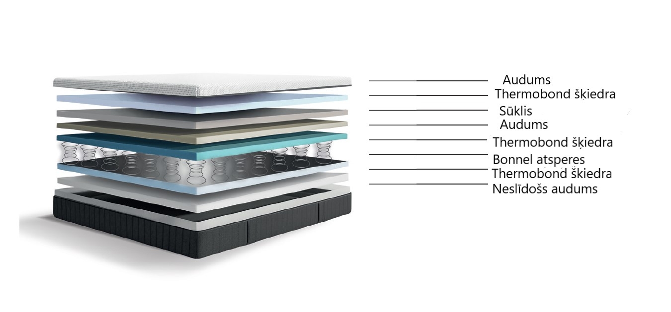 Matracis Kingston. Daudzslāņu vidēji ciets vienpusējs matracis. Tas pielāgojas jūsu ķermeņa formai un piedāvā perfektu miega risinājumu ar kokvilnas satīna sajaukto audumu, papildu komfortu un īpaši izstrādāta daudzslāņu pilna ortopēdiska struktūra. Matracis ietver visus risinājumus mugurkaulam draudzīga matrača meklējumiem, izmantojot pilnas ortopēdiskas atbalsta putas un īpaši mīkstu papildu komfortu putas ar Bonnell atsperu tehnoloģiju, perimetra pastiprinājumu.