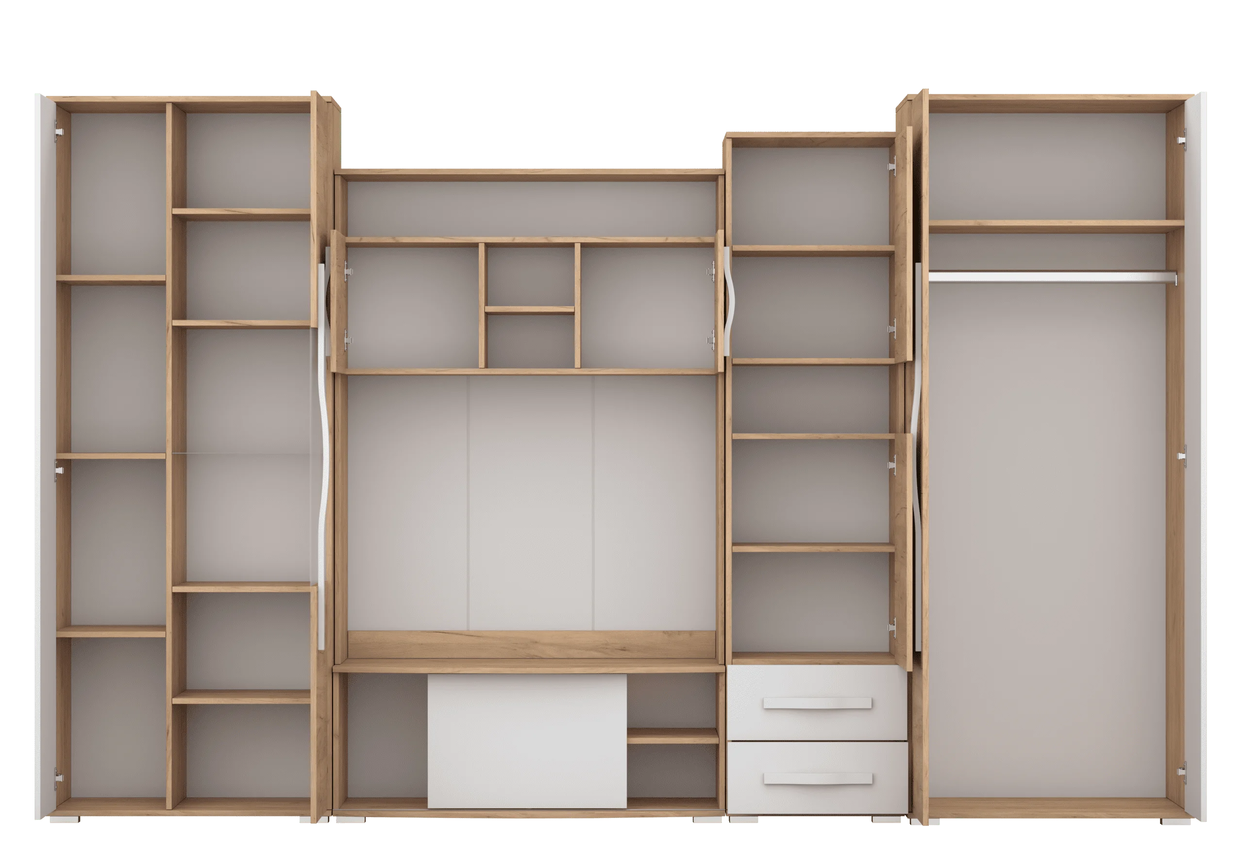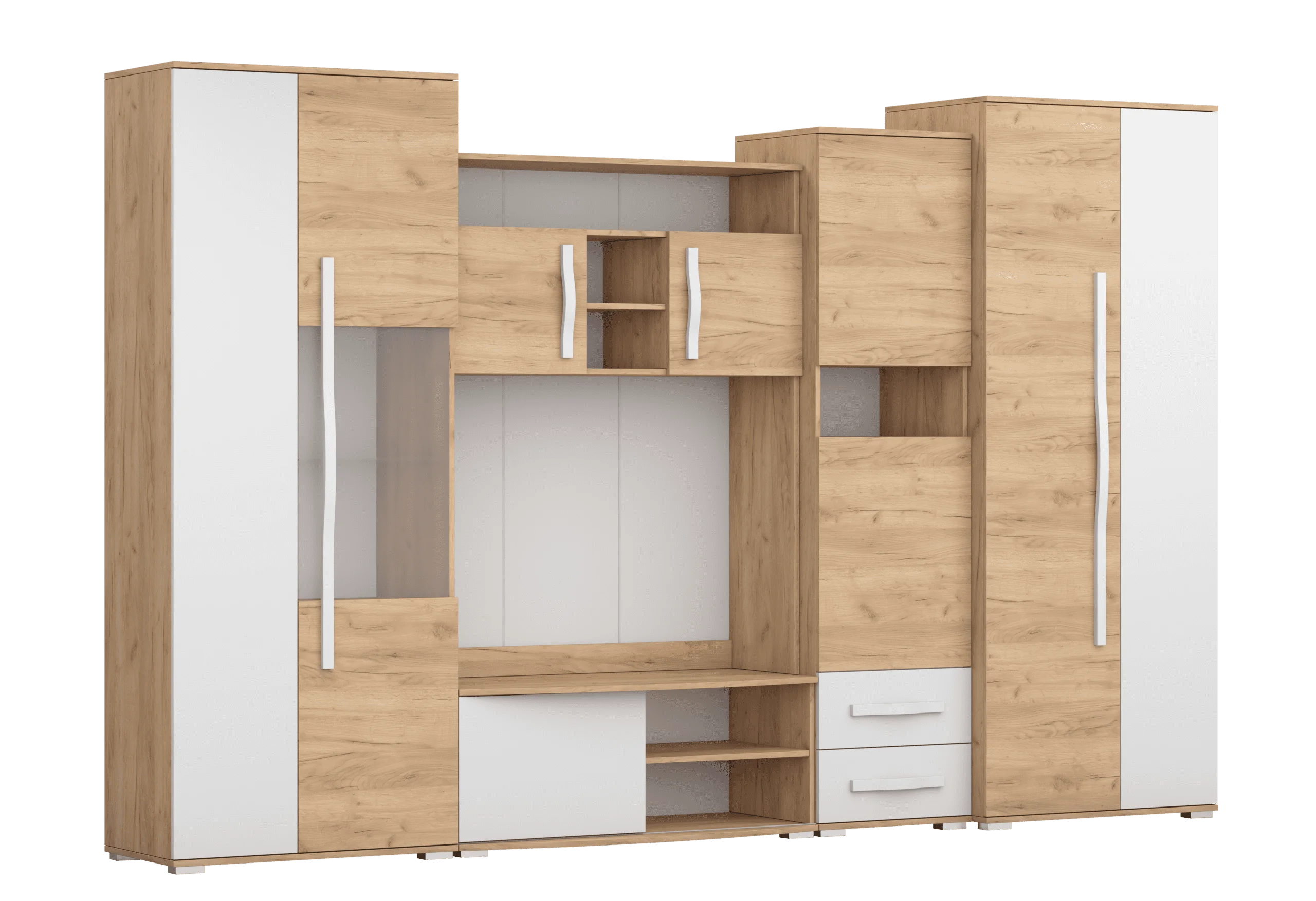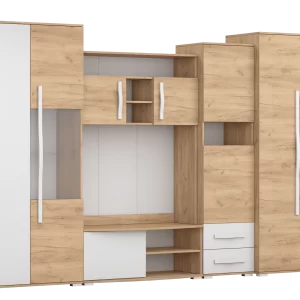 ✅ Kontrasta dizains – balta plātne starp RTV dobumojumu un augšējo plauktu piešķir komplektam unikālu vizuālo efektu.