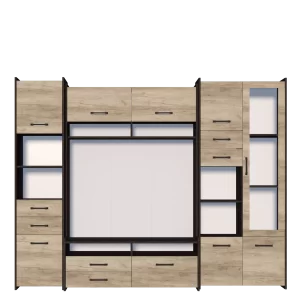 Sienas blokam ir moderns dizains un kvalitatīvas apdares materiāli. Tas piedāvā vietu televizoram un daudzpusīgus uzglabāšanas risinājumus, piemēram, plauktus un vitrīnu ar stikla elementiem, kas izceļ interjera akcentus. Bloka konstrukcijā nav dēļa starp RTV bloku un paplašināšanas bloku, kas piešķir mēbelēm vieglumu un gaisīgumu.