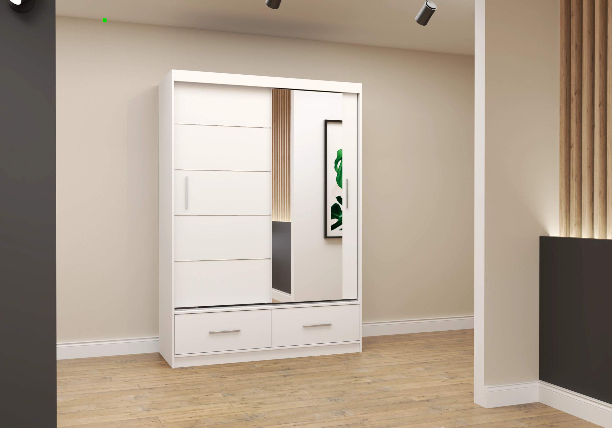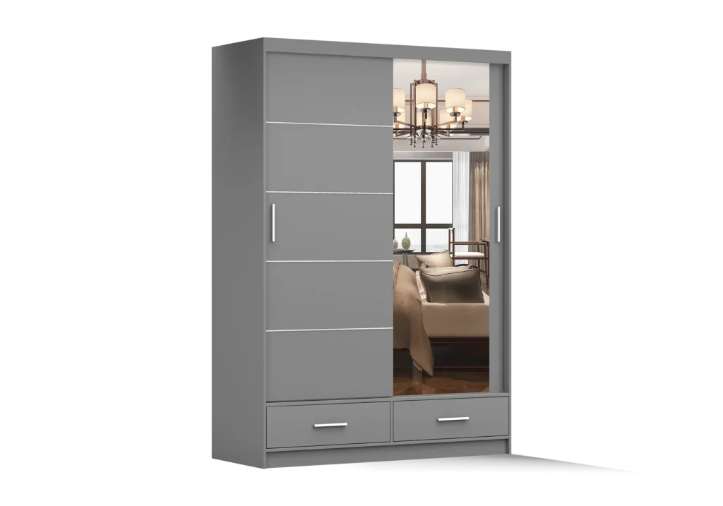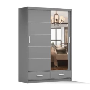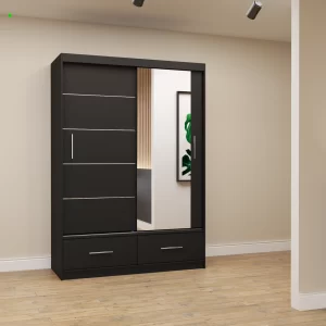 FLORENCE 150 cm bīdāmais skapis ar spoguli un atvilktnēm ir lieliski piemērots guļamistabai, garderobei vai viesistabai. Plašs iekšējais izkārtojums ar 6 plauktiem, 2 drēbju turētājiem un 2 atvilktnēm nodrošina ērtu uzglabāšanu, bet lielais spogulis vizuāli paplašina telpu.