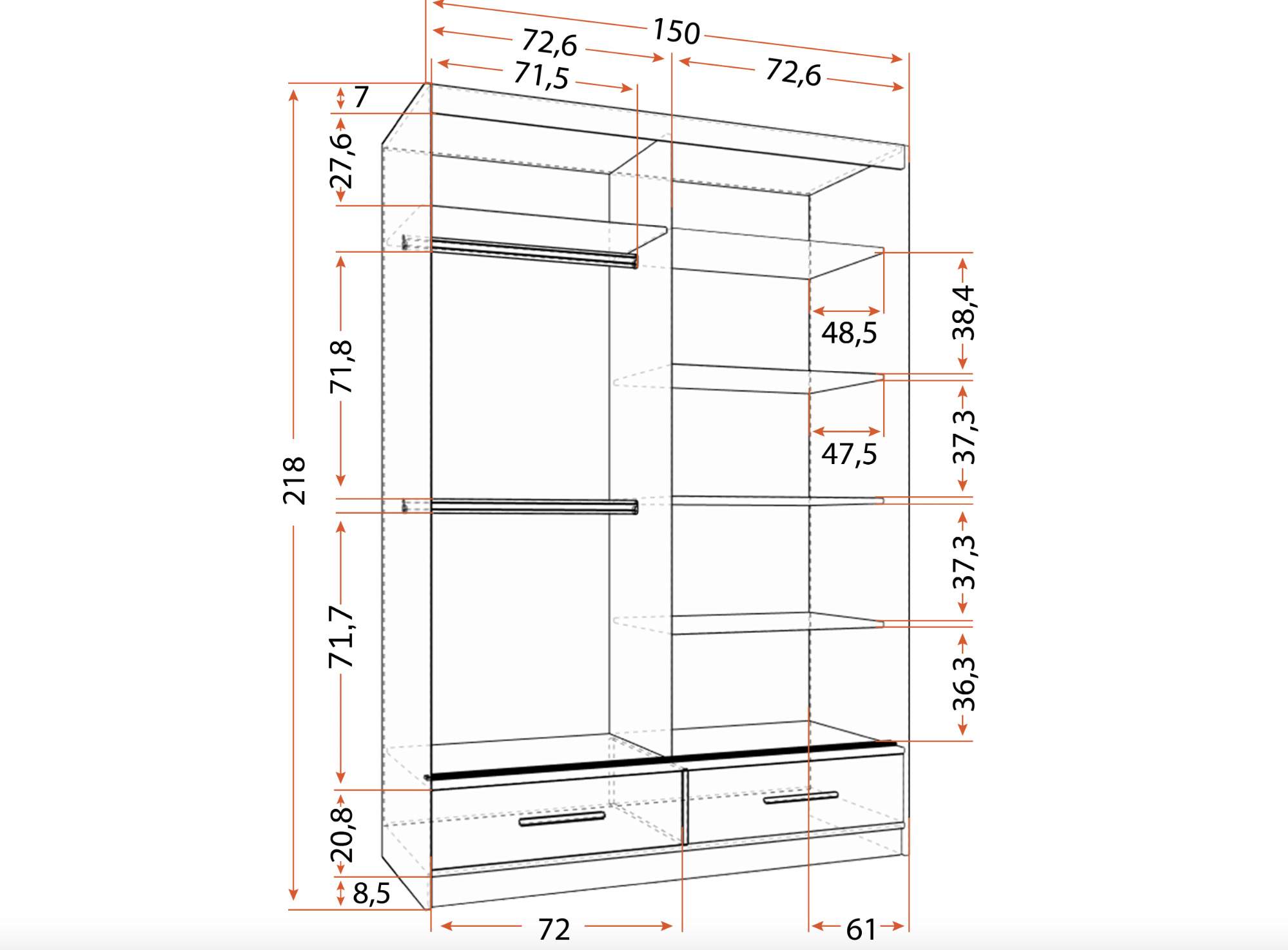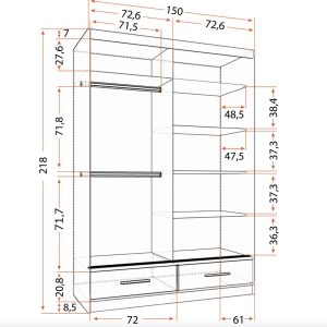 Iekšējais skapis ir sadalīts divās zonās: 6 plaukti, telpa ar 2 drēbju turētājiem un 2 ietilpīgas atvilktnes, kas ļauj ērti uzglabāt apģērbus, apavus, gultasveļu un citus priekšmetus. -