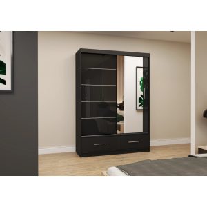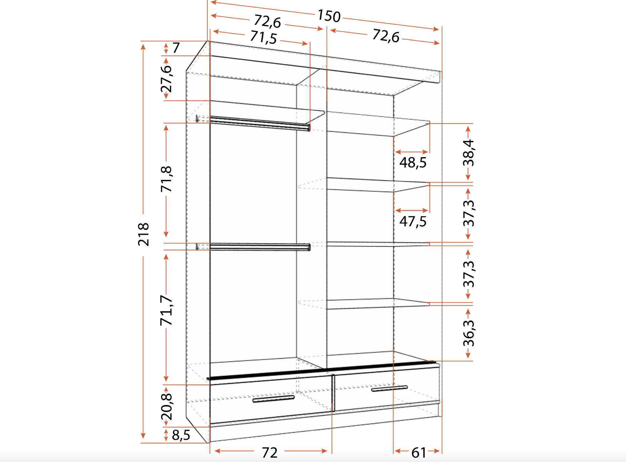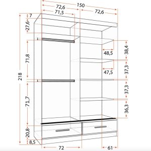 Divas zonas ar 6 plauktiem, telpu ar 2 drēbju stangām un 2 ietilpīgām atvilktnēm ļauj ērti uzglabāt apģērbus, apavus, gultasveļu un citus priekšmetus. -