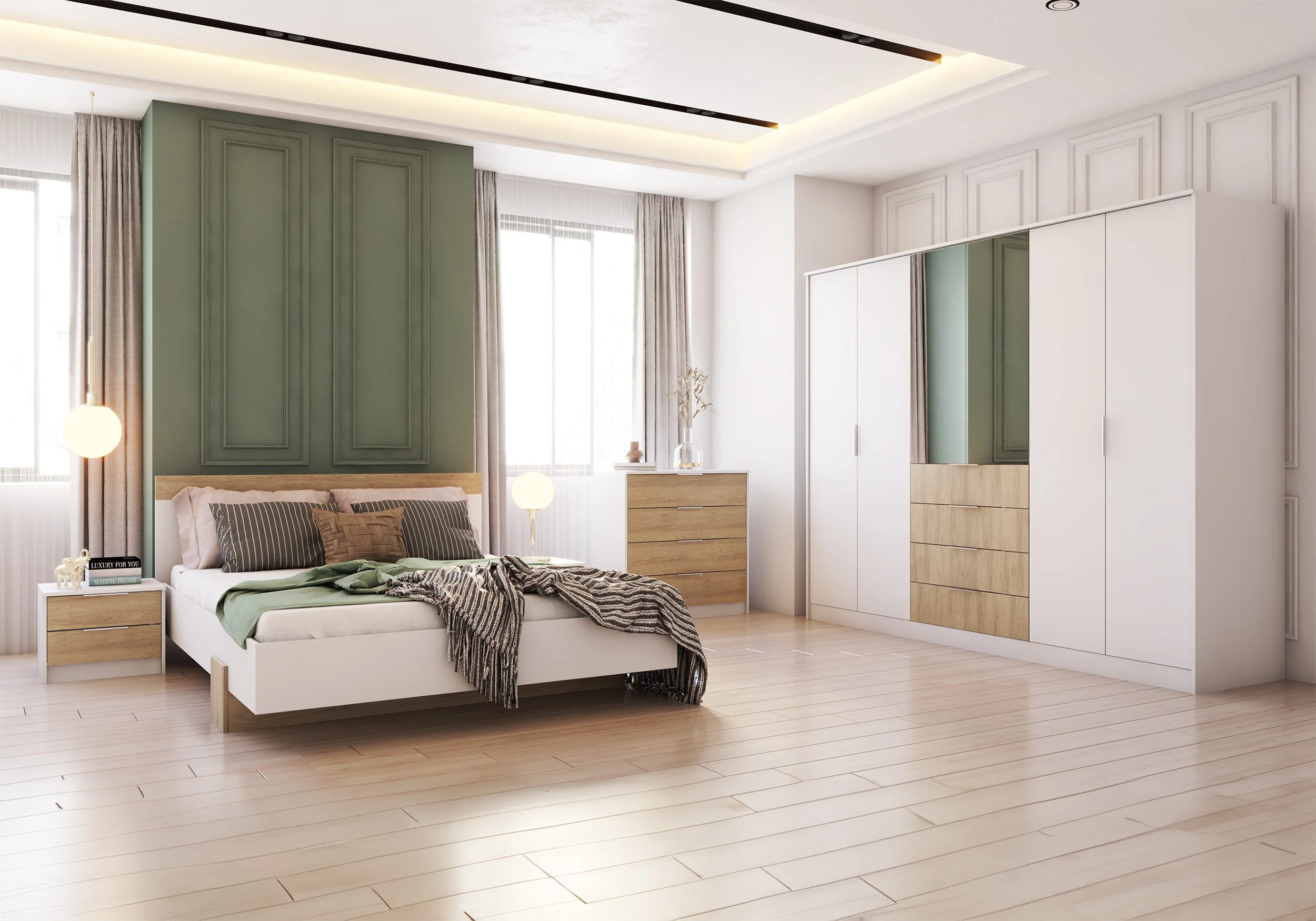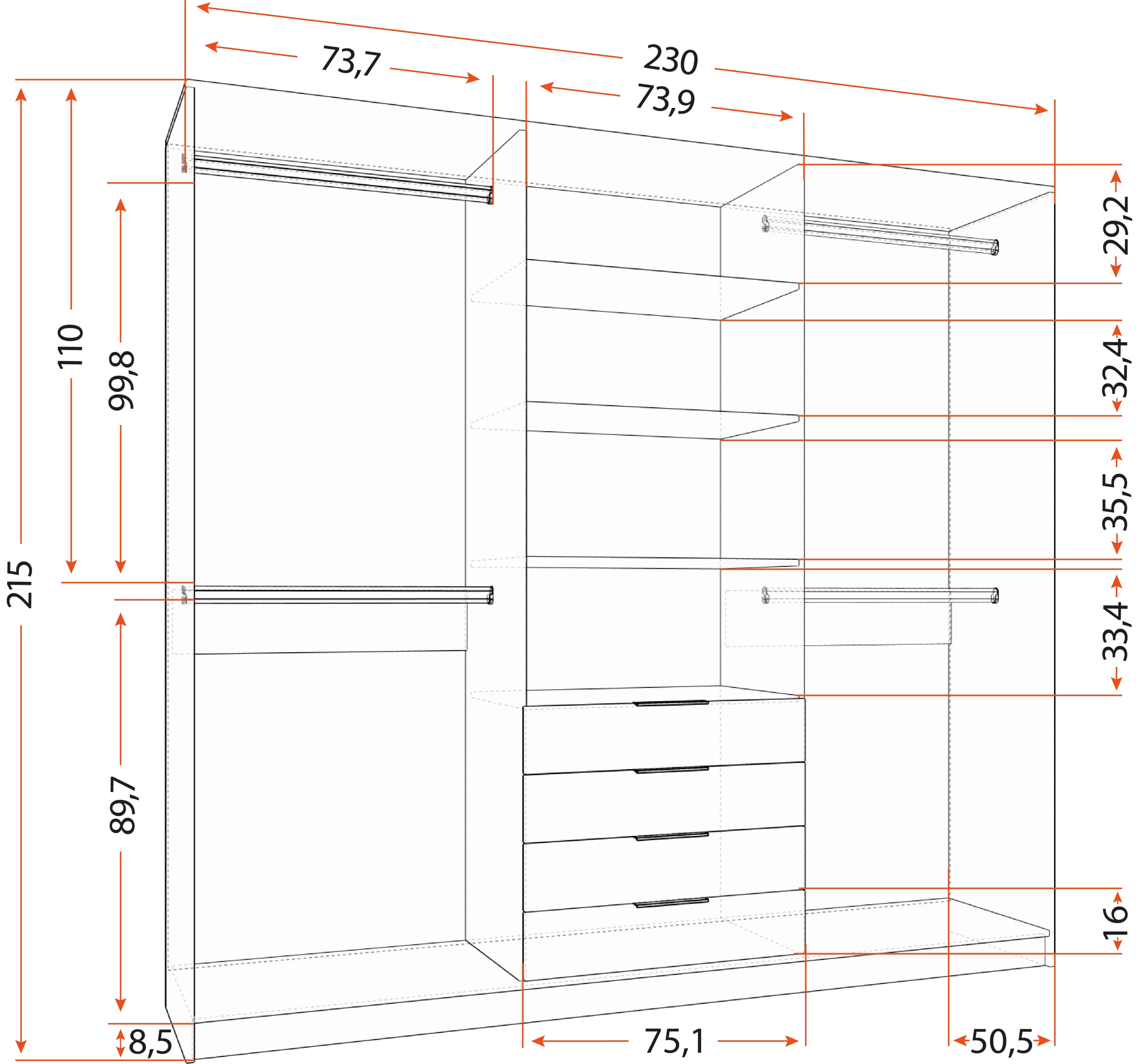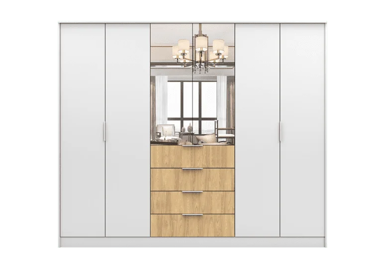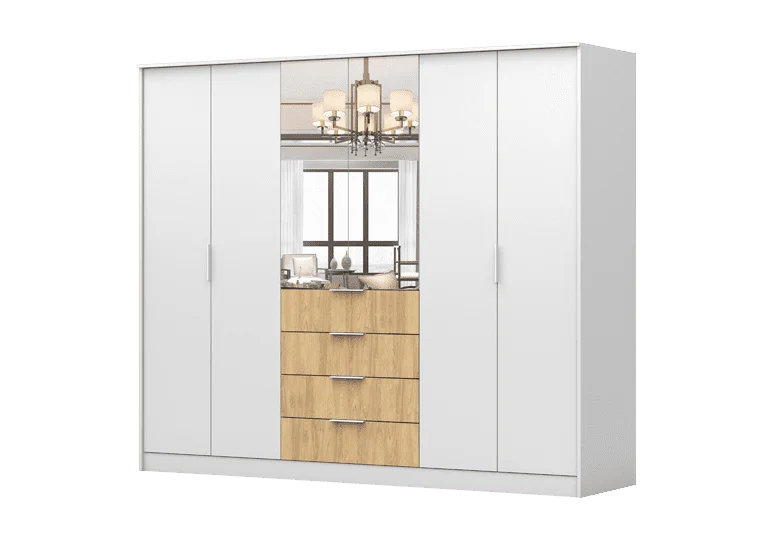 Drēbju skapis Galaxy – moderna dizaina un plašas uzglabāšanas iespējas! Lieli spoguļi, četri drēbju stieņi, plaši plaukti un atvilktnes. Izgatavots no kvalitatīvas laminētas plātnes (16 mm) ar ABS maliņām. Ideāli piemērots guļamistabai, viesistabai vai garderobei. Pasūti tagad Tukaimebeles.lv