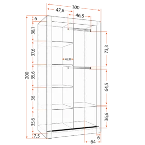 ✔ Plašs iekšējais izvietojums – plaukti un divi stieņi drēbju pakarināšanai.