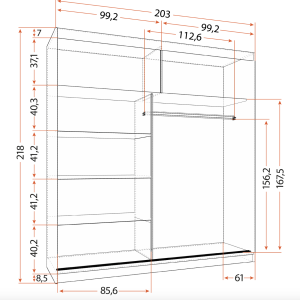 Skapis ir sadalīts divās daļās, katrā ar vairākām ietilpīgām plauktiem un drēbju stieni, kas ļauj ērti uzglabāt apģērbus un citus priekšmetus.