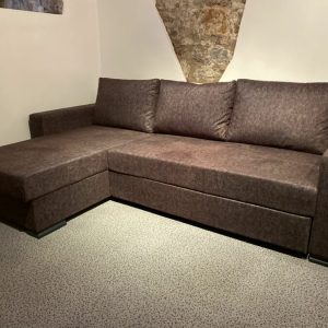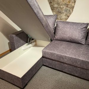 Dīvāna guļamvieta ir plaša un ērta gulēšanai, nodrošinot uzticamu transformācijas mehānismu, kas garantē kvalitāti un izturību. Drēbju kaste zem sēdekļa nodrošina ērtu vietu gultas veļas, segu un spilvenu uzglabāšanai.